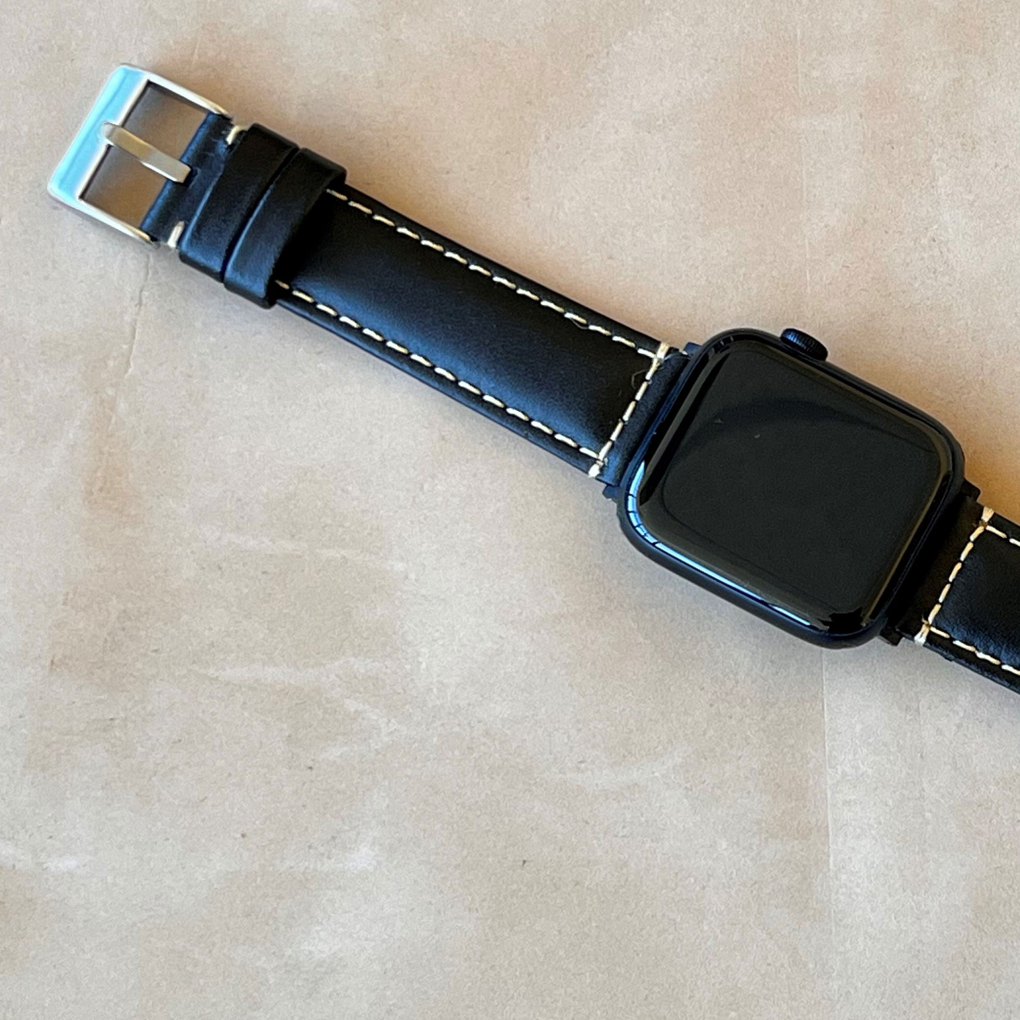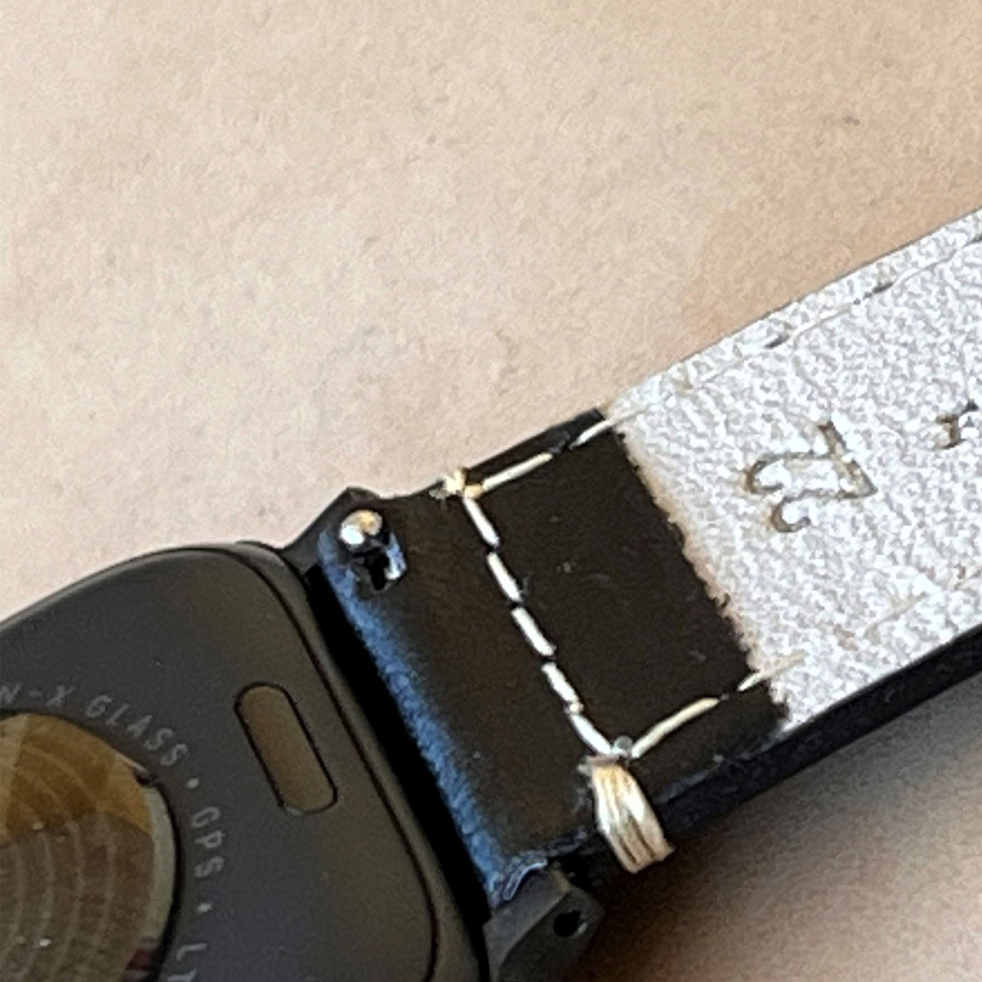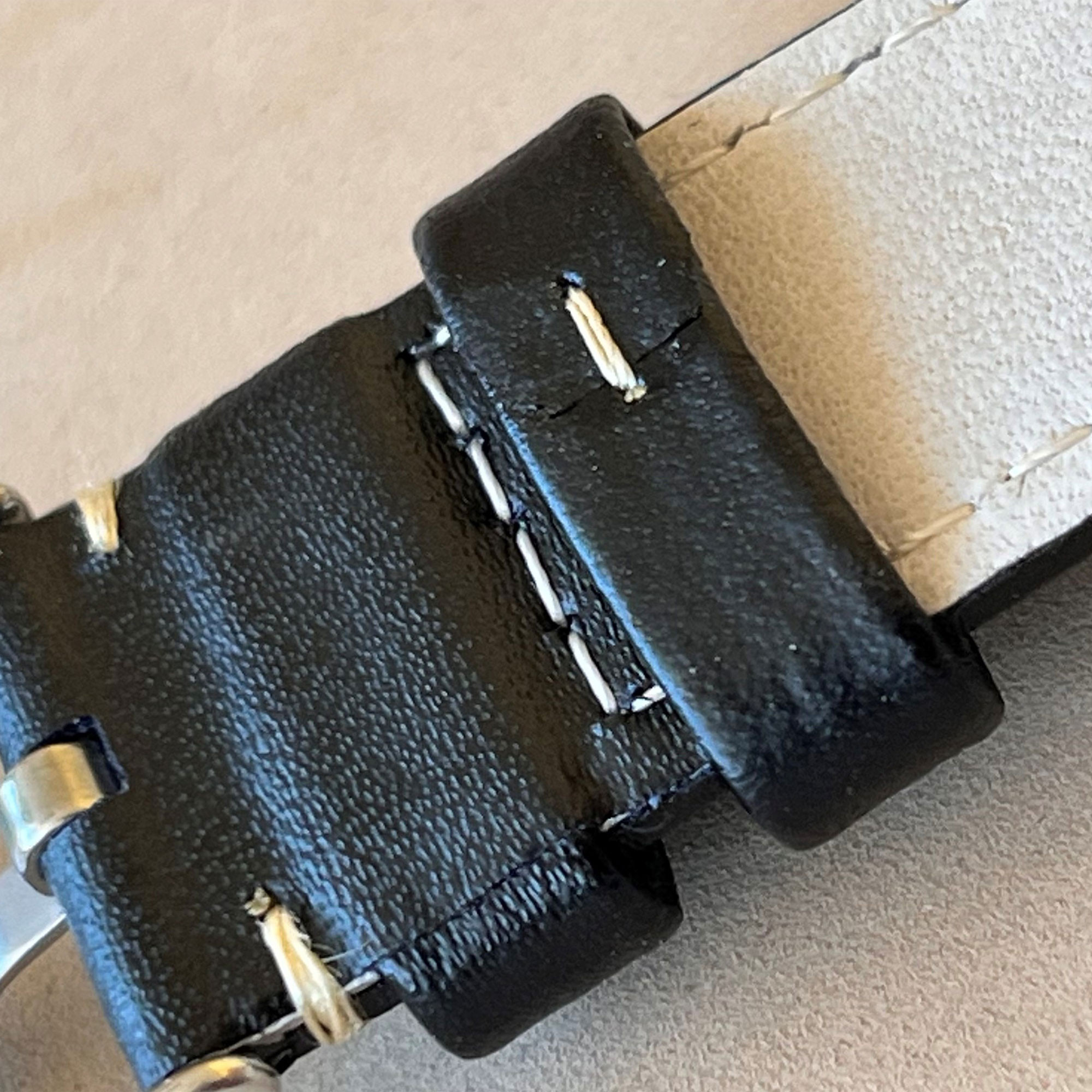 Usamos dos trabillas o pasadores vueltos hechos con el mismo cuero que la superficie de la correa, una fija y otra móvil. La trabilla móvil está reforzada por una costura en su parte posterior. Es común que las trabillas parezcan de diferente color que la correa. Esto es debido al comportamiento del cuero al someterlo a diferentes tensiones. Si dobla la correa verá cómo se aclara y adquiere un tono más similar al de la trabilla. El color de la correa tenderá a oscurecerse a media que vayan transcurriendo los días en su reloj.