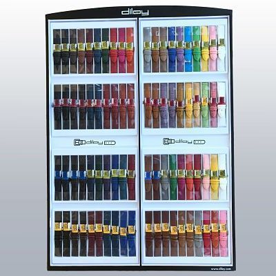 Expositor de pared negro sin puerta para correas de reloj. En el interior se pueden montar carpetas Diloy de 48 o 40 unidades. De esta manera es fácil configurar el expositor según las necesidades de la tienda: