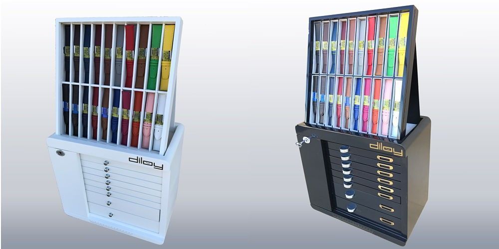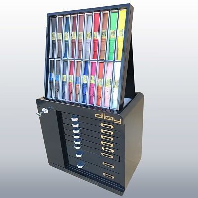 Expositor de sobremesa para correas de reloj modelo E100 lacado en color negro. Consta de 8 cajones, 2 preparados para contener cualquier ancho de correo o incluso alguna herramienta de mano. Fabricado en madera y lacada
